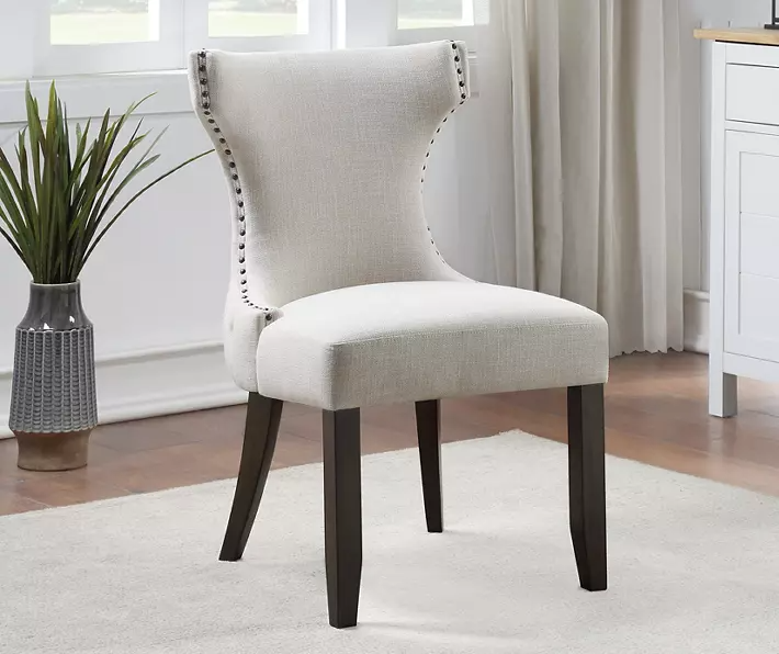 Blending both the traditional décor aesthetic and comfort, this padded office chair by Broyhill has your posture in mind. Featuring a stately bronze metal nailhead trim, durable canvas fabric and a diamond-tufted curved back, this chair can easily serve as all three an office chair, formal dining room chair and living room accent piece.