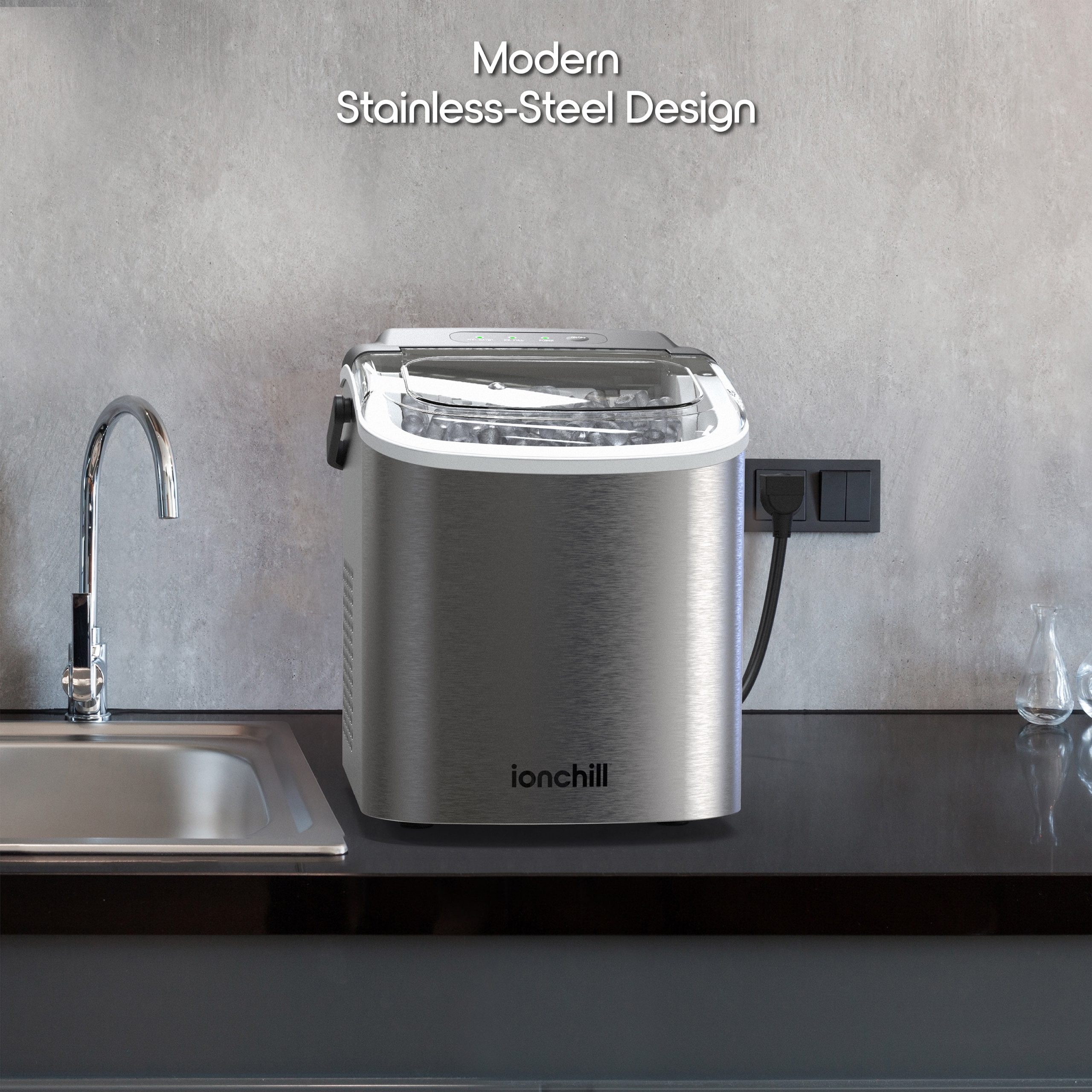 Quenching your thirst is easier than ever with the new ionchill Quick Cube! With just the press of a button, this compact ice maker can have bullet-shaped ice cubes ready in just 9 minutes and can make up to 26lbs of ice in 24 hours. Simply add water to its large 1.2L tank, press ON, and let the Quick Cube work its magic. Lightweight, and designed for easy portability, this countertop ice machine is the perfect addition to any home or office. Plus, the Self-Cleaning mode and stainless-steel construction make maintenance easy. Whether you’re making smoothies or cocktails, the ionchill Quick Cube is the cooler way to ice!