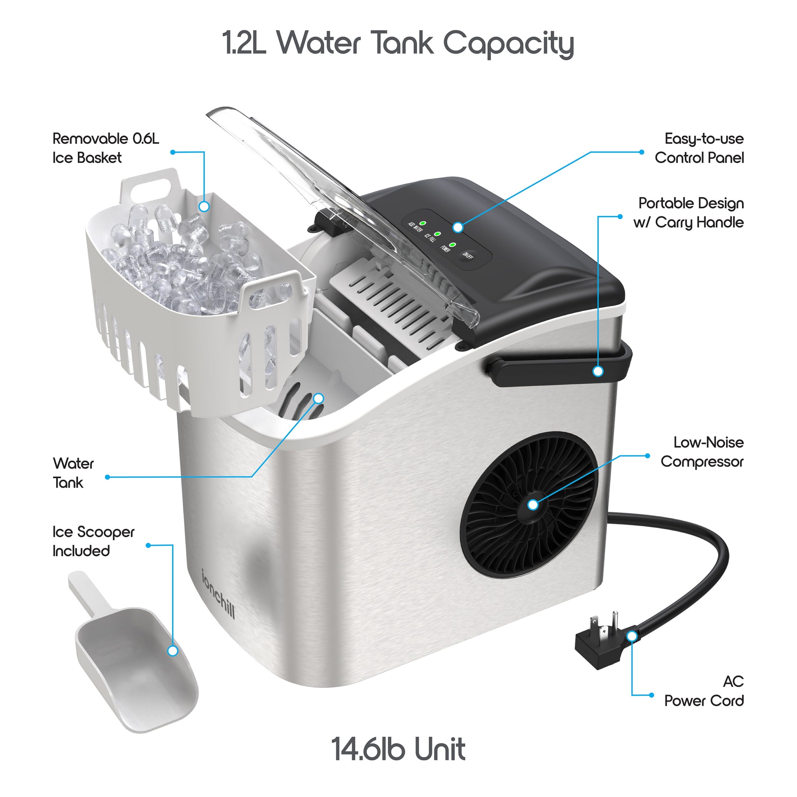 - Specs: Input – 115V/60Hz; Power – 95W; Water Tank Capacity – 1.2L; Ice Basket Capacity – 0.6L; Dims – 11 x 11.4 x 8.5in, 14lb